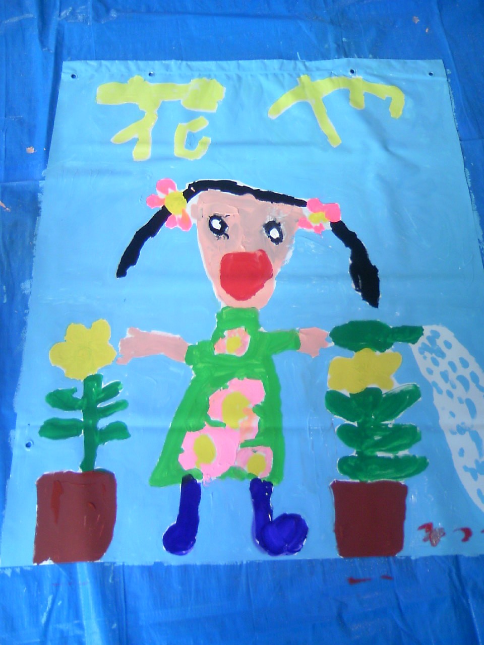 千歳船橋商店街が主催する「ペナント作成会」に参加する。船橋小学校の多目的ルームいっぱいにビニールシートを広げ、参加する子供たち一人一人が思い思いの絵を書いて、商店街の街路灯につりさげるペナントを作成するイベント。三都美は去年に続いて2回目の参加。7月から約1ヶ月間、千歳船橋駅北口の千歳船橋商店街のどこかではためく。
