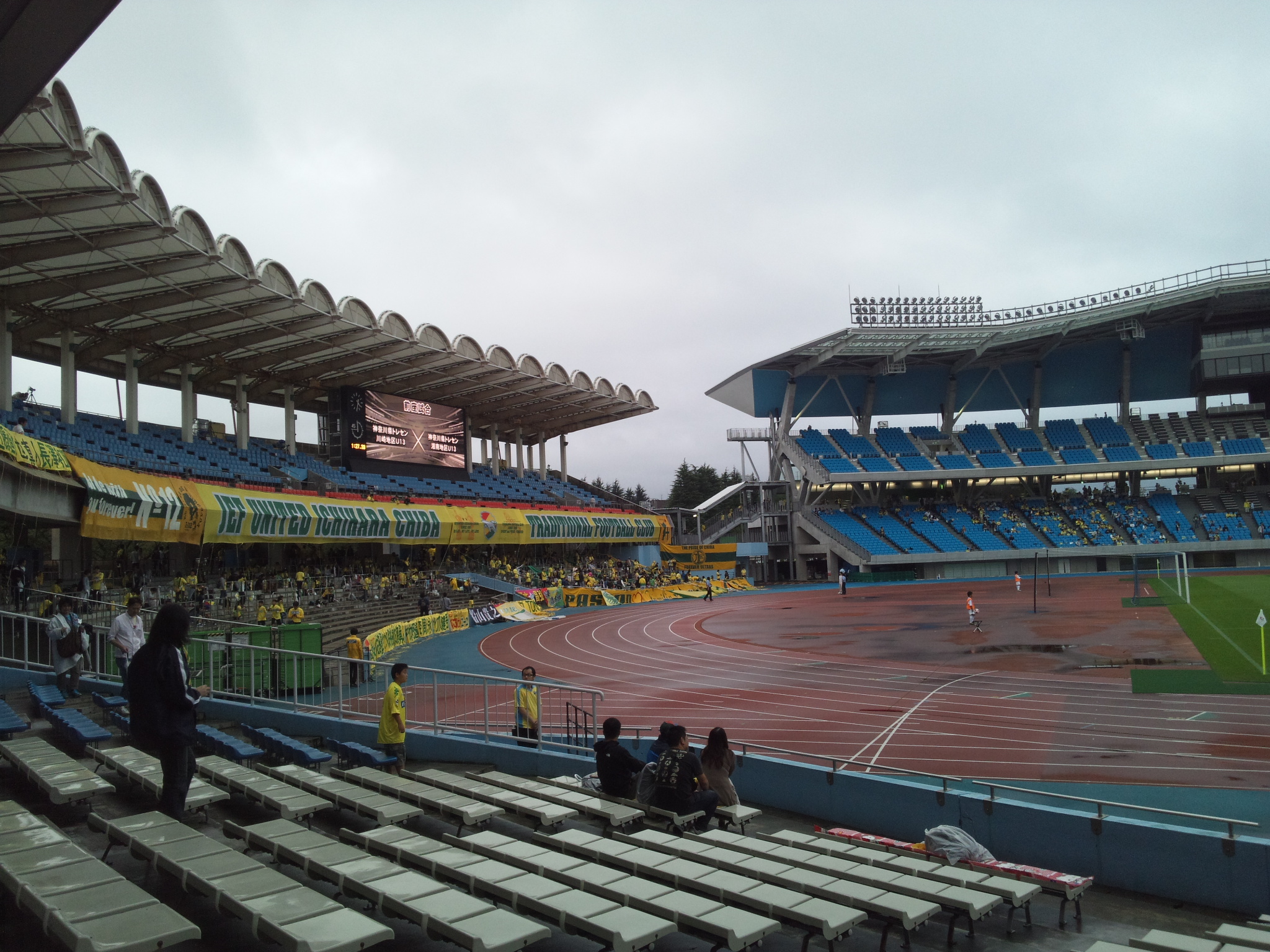 今シーズン4度目のジェフ戦スタジアム観戦で川崎市の等々力陸上競技場へ。J2降格が決まったあの日2009年11月8日、自分は繁忙期の真っ最中で休日出勤していたため現地にはいなかった。最後に訪問したのは2000年8月19日だったようだ。JR南武線武蔵中原駅から歩くこと約15分、途中のコンビニでチケットと食料を調達し、キックオフ1時間半前の16時30分ごろスタジアムに到着。雨を避けるため2階席がせり出している下(バックスタンドコーナー付近1階席)に陣取ったが、風が吹くと細かい雨が当たる。前座試合を見ながらキックオフを待つ。
